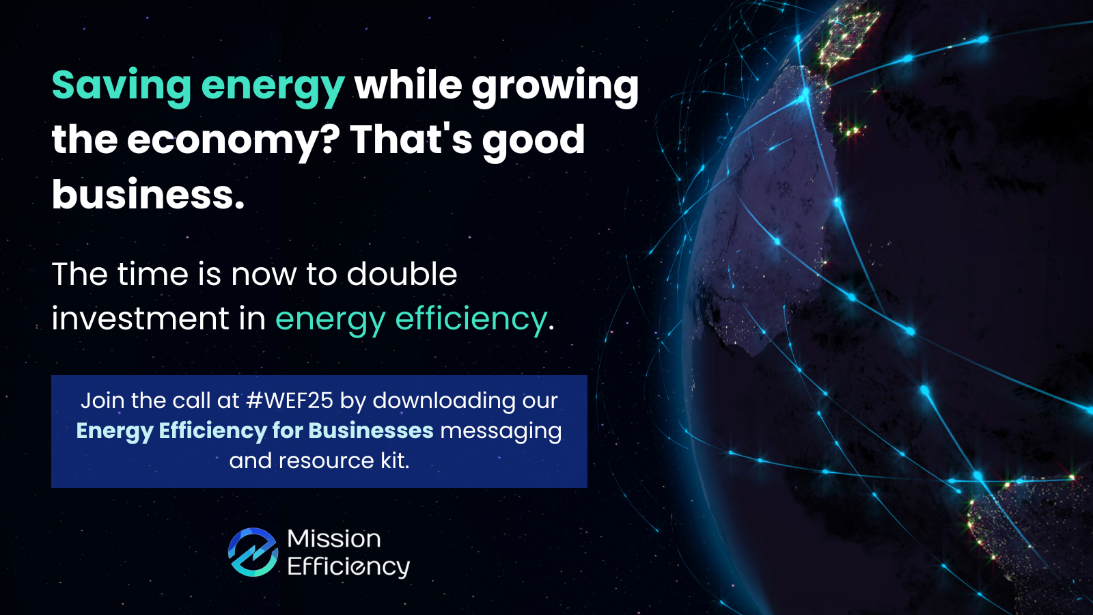 Join the call for increased investment in energy efficiency. Click here to download Mission Efficiency’s “Energy Efficiency for Corporates” messaging guide, complete with key talking points, sector-specific statistics, and resources for further reading. Tag @Mission Efficiency in any posts during #WEF25.